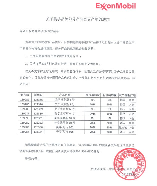 关于美孚品牌部分产品变更产地的通知